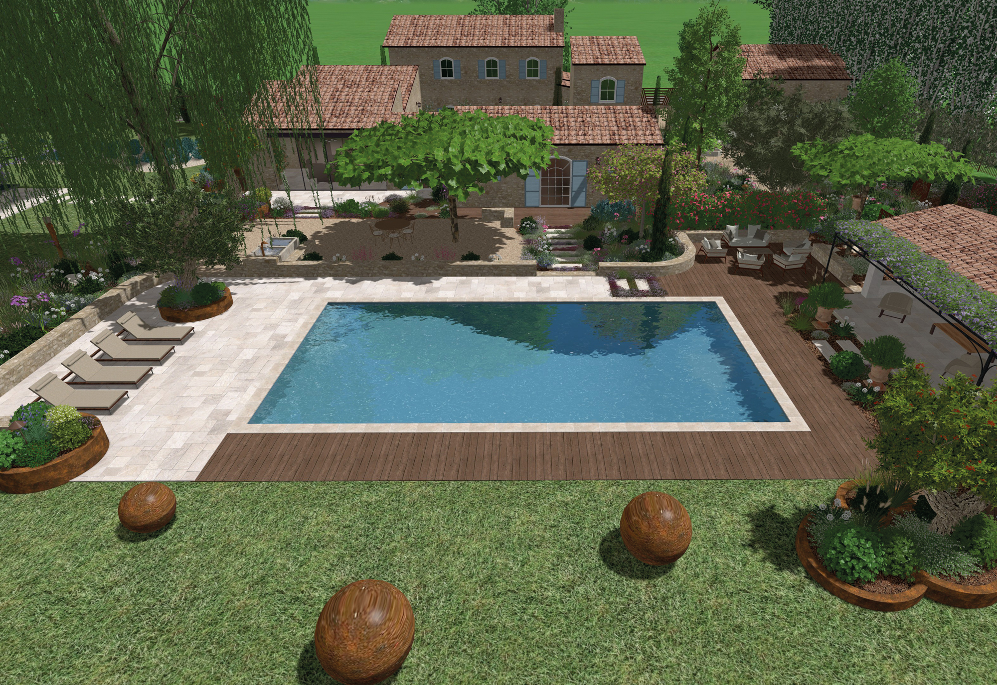 Le mariage des matières nobles (pierre, bois, métal, eau et voile d'ombrage en toile coco) avec la végétation, accentue l’authenticité du style paysager recherché.