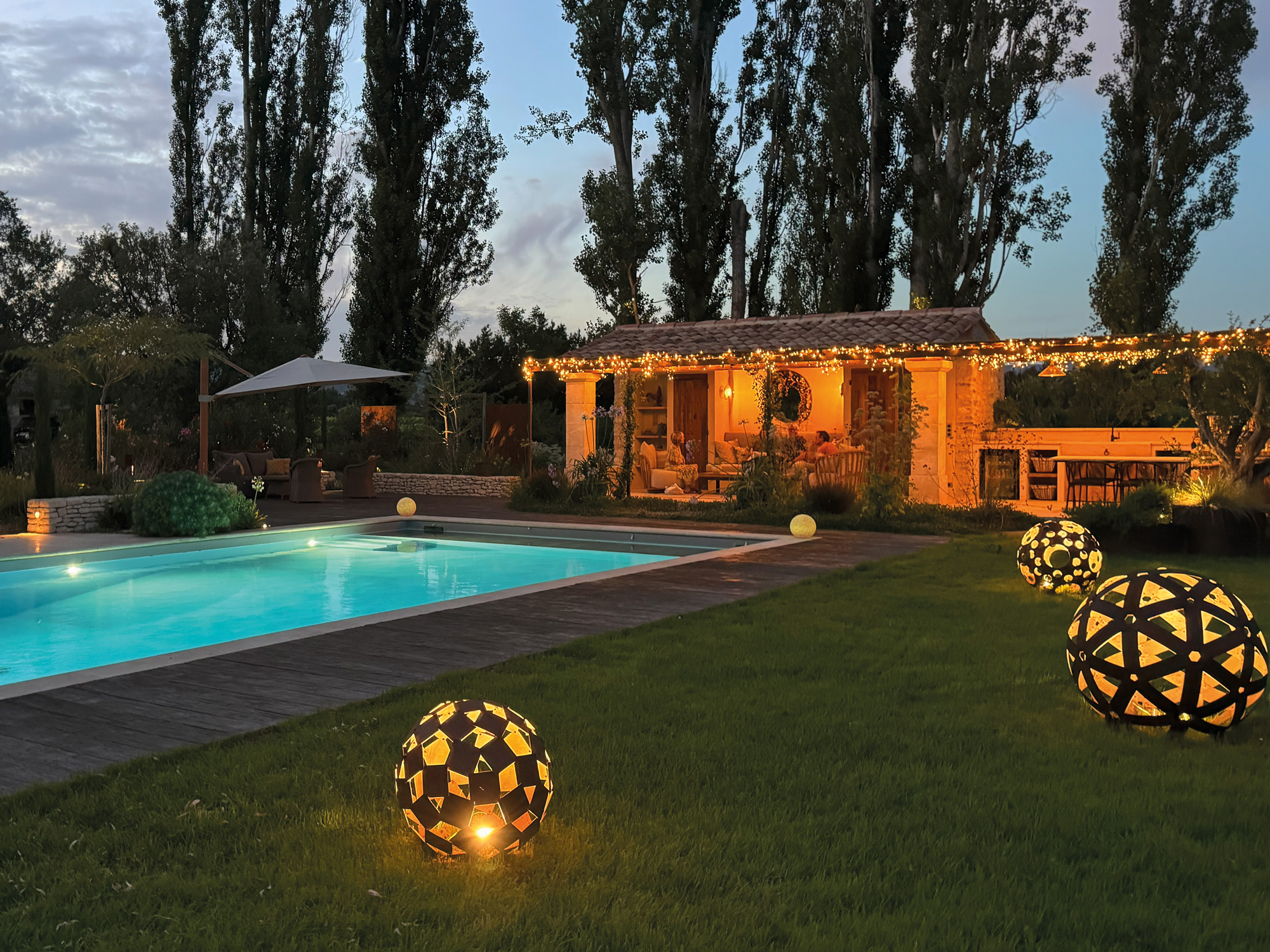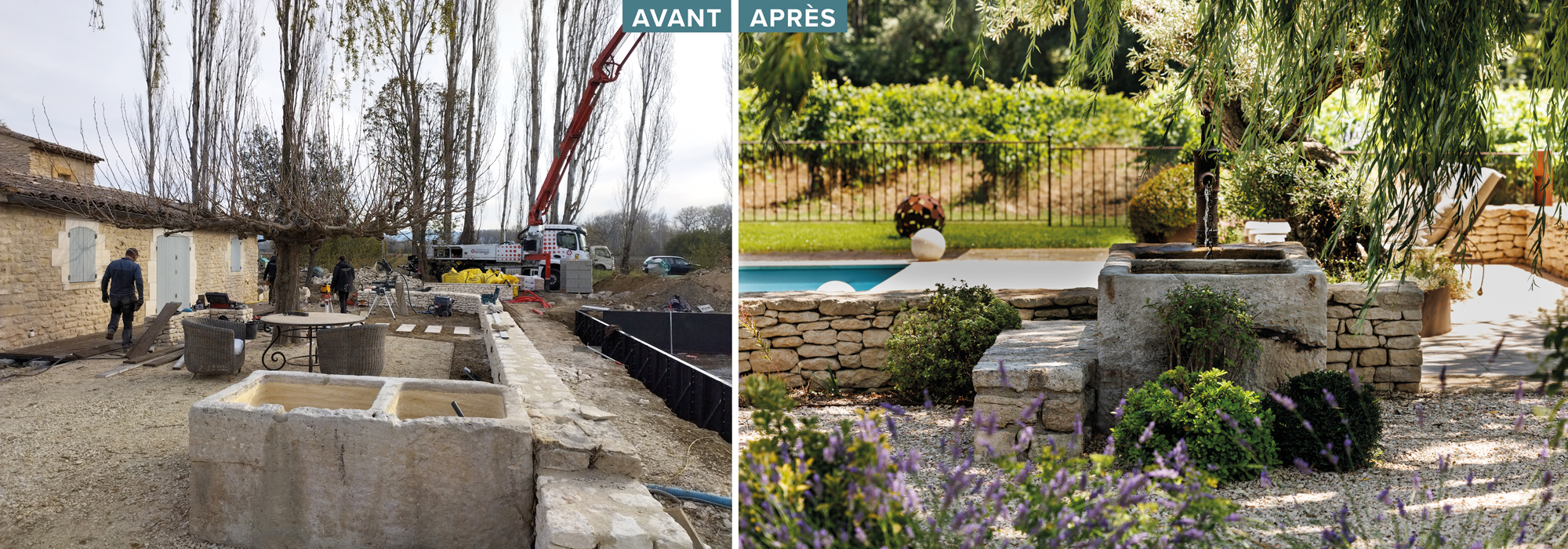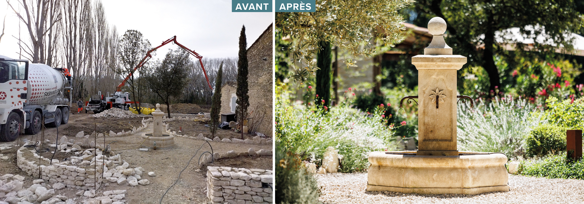 La planification a nécessité plusieurs itérations de conception, notamment via des maquettes 3D et des échanges réguliers avec les clients. “Ils nous donnaient des grandes lignes, des idées en photos, et on leur présentait à chaque changement un film en 3D pour qu'ils puissent se projeter. Il nous a fallu 6 à 8 mois de conception, 5 ou 6 propositions et améliorations des plans alors même que certains travaux débutaient. Une forme de jardin évolutif”, explique Olivier Mosnier. Côté réalisation, elle s’est étalée sur plus d’un an, en différentes phases de travaux. Le chantier a impliqué plusieurs corps de métier : l’entreprise de paysage Accent du Sud pour la majorité des travaux, des artisans spécialisés pour la pierre, la cuisine d’été et la piscine et une entreprise spécialisée pour la conception de l’éclairage d’extérieur. L’architecte-paysagiste, maître d’œuvres des extérieurs, s’en souvient : “La coactivité n’a pas toujours été évidente puisque les entreprises ne se connaissaient pas toutes. Finalement, le projet s’est bien déroulé. Il nous a tout de même fallu bien orchestrer tout le monde !” D’autre part, la sélection des matériaux a été méticuleuse pour favoriser l’authenticité et l’intégration paysagère. “Nous avons chiné, en compagnie des clients, dans tout le Lubéron et jusqu'à Carpentras pour trouver des éléments anciens qui s'intègrent parfaitement à l'esprit du projet. Pierres, éviers, fontaines, ferronneries… On a bien couru pour trouver ces trésors !”