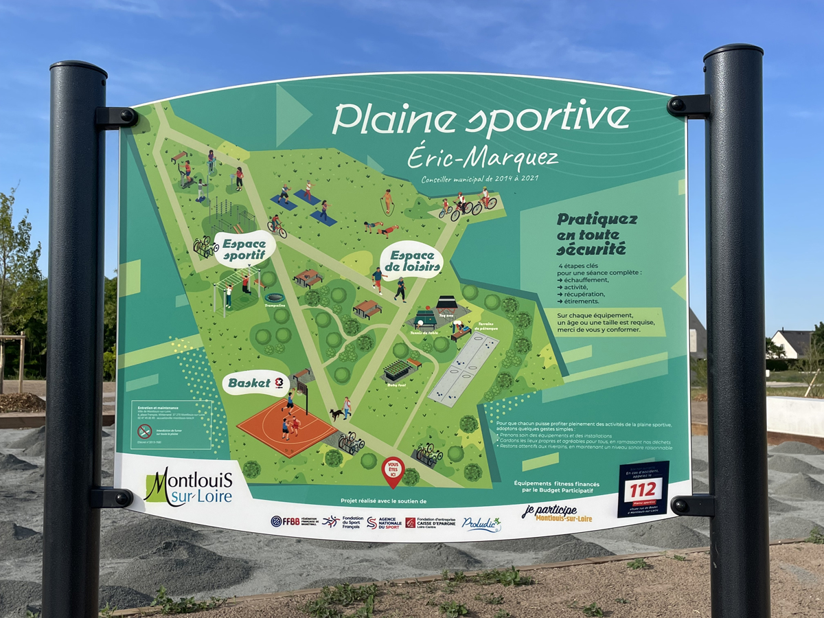 Le panneau signalétique de la plaine sportive décrit notamment le site et diverses expériences de jeu.