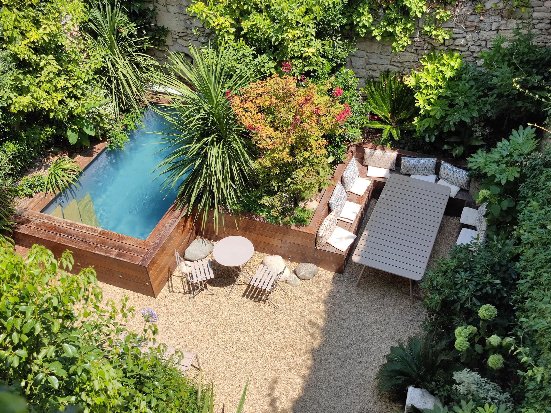 Nichée au cœur du village, à l’arrière de la maison, cette cour bordée de murs en pierre n’était accessible que par l’intérieur. Le client voulant une piscine, Sylvère Fournier et son équipe ont préféré l’installation d’une piscine semi-enterrée en bois et la réalisation de jardinières pour réutiliser un maximum de terre et limiter son évacuation. L’extraction de cette dernière s’est faite grâce à une micro-pelle de 800 kg, aux chenilles rétractables, afin de circuler entre les portes de la maison.