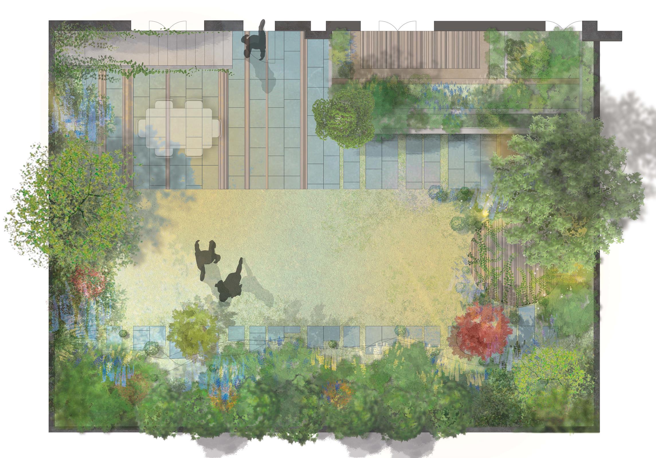 L’espace, à la fois exposé au soleil et à l’ombre accueille plantes exotiques et d’ombrages qui créent une ambiance cocooning et sauvage. “Les clients avaient besoin de fraîcheur. De ce fait, on retrouve, côté piscine, des Dracaena, et un érable qui fait la transition avec les végétaux d’ombre”, décrit Sylvère Fournier. Un réseau de goutte à goutte a été installé sur l’arrivée d’eau de la maison, équipé d’un programmateur à piles WooBee de Solem. “Comme je l’explique aux clients, pour moi le jardin est une pein- ture. Je veux donc garder la liberté de placer et de déplacer les plantes”, raconte le maître jardinier. “En effet, c’est plus facile pour moi du fait de mon ‘titre’. Mes clients me font confiance et partagent ma vision du végétal. Après tout, nous travaillons avec du vivant. Et le vivant est changeant”, rajoute-t-il. Ainsi, c’est seu- lement lorsque le camion arrive rempli de végétaux que les clients découvrent l’entièreté des espèces prévues pour leur jardin.