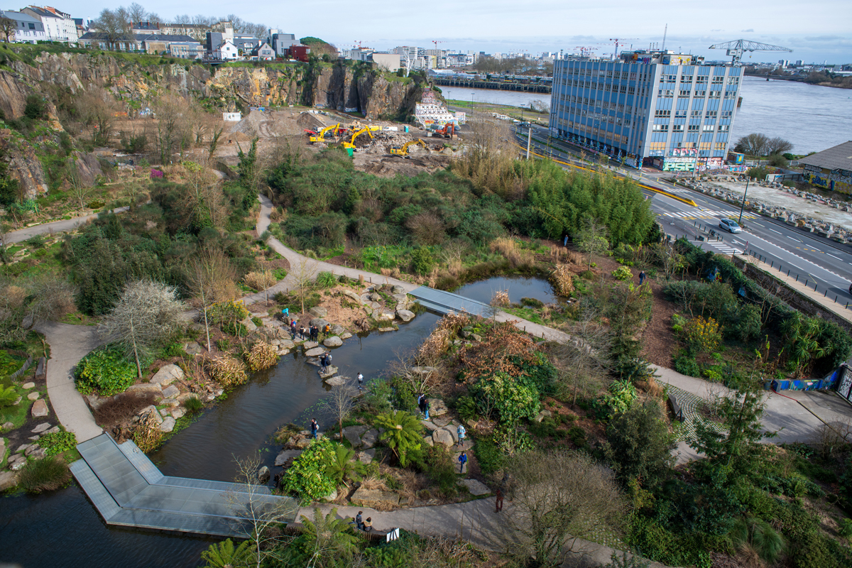 Conçu sur une ancienne friche industrielle qui n’avait plus accueilli de visiteurs depuis 1985, ce Jardin Extraordinaire a ravivé l’intérêt des habitants pour ce lieu. Cascade de 25 m de hauteur (oui, oui, en pleine ville !), escalier à flanc de falaise, plantes méditerranéennes et tropicales mêlées aux espèces locales… Le jardin semble presque irréel tant il se situe dans une “dent creuse” de la Ville. Les jardiniers ont ainsi mené un travail remarquable pour le rendre attractif et fonctionnel. “Nous avions déjà préparé le terrain pour le projet de l’arbre aux hérons et réalisé de nombreuses plantations. À l’époque, nous nous étions rendu compte du potentiel de cet espace…”, raconte Franck Leminoux, jardinier chargé des équipes espaces verts du quartier Bellevue. Ce jardin de 4 ha (sur la première phase : 200 m3 d’enrochement, 350 m3 de rochers et 1 050 m² de bassins et berges humides)a été conçu par l’agence de paysage Phytolab et a pour vocation de valoriser l’univers de Jules Verne, célèbre écrivain originaire de Nantes. “La direction nature et jardins, les jardiniers et les paysagistes concepteurs ont travaillé ensemble sur ce projet pour recréer une ambiance naturelle dans un lieu totalement artificiel”, souligne Thomas Grimaud, responsable du service espaces verts sur les quartiers Ouest de Nantes.