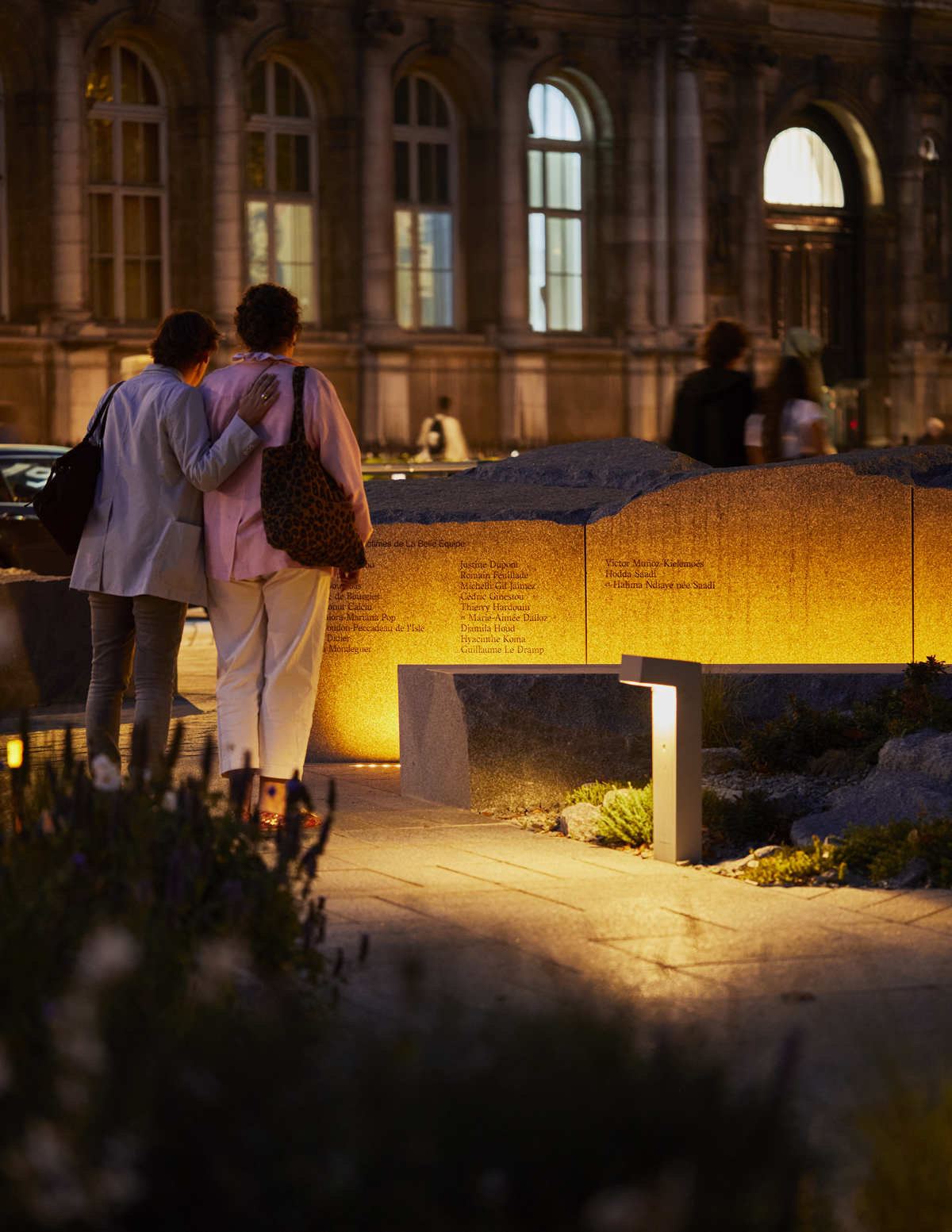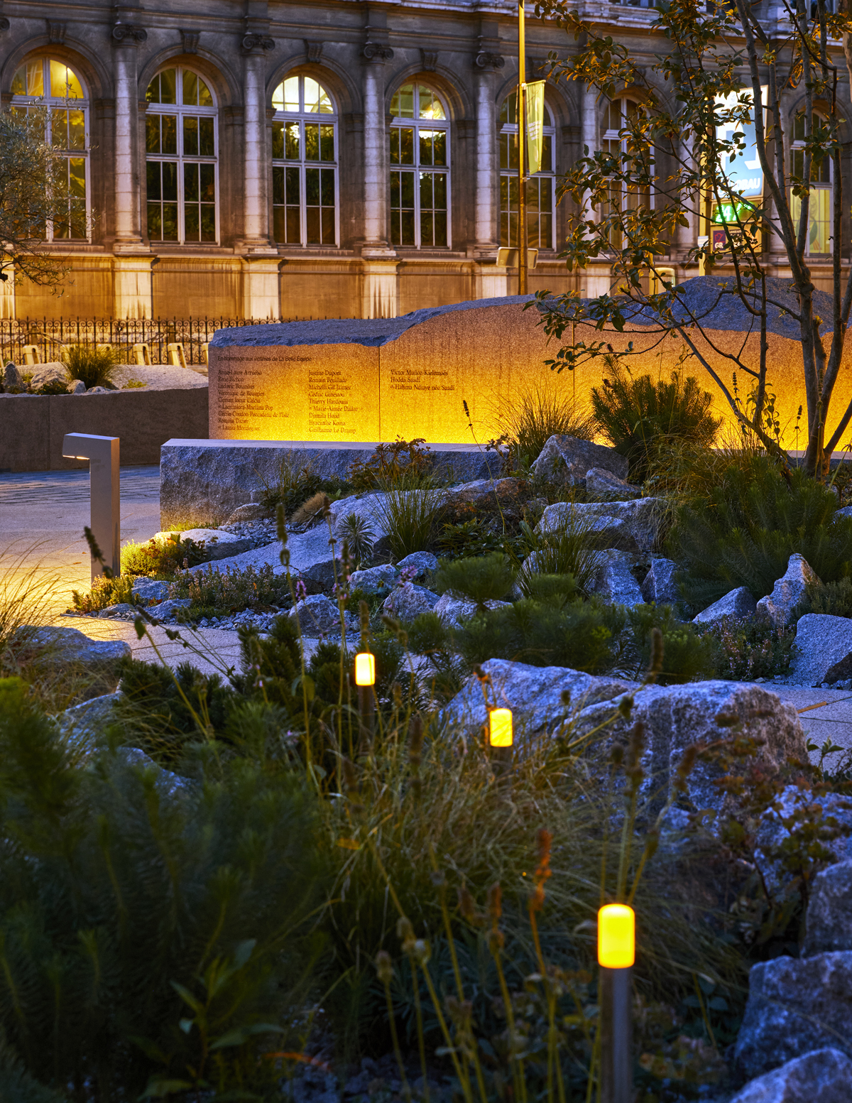 Eclairage des stèles et des allées Les stèles en granit breton, sur lesquelles sont gravés les noms des victimes, organisent les espaces plantés (452 m² au total). Elles sont mises en lumière rasante par des solutions Led encastrées dans des réservations au sol. Les encastrés sont disposés près des stèles afin de mettre en lumière les creux et légers reliefs de l’écriture. Les allées entre les jardins sont éclairées par des bornes Ewo de 30 cm de haut, de teinte identique aux blocs de pierre.