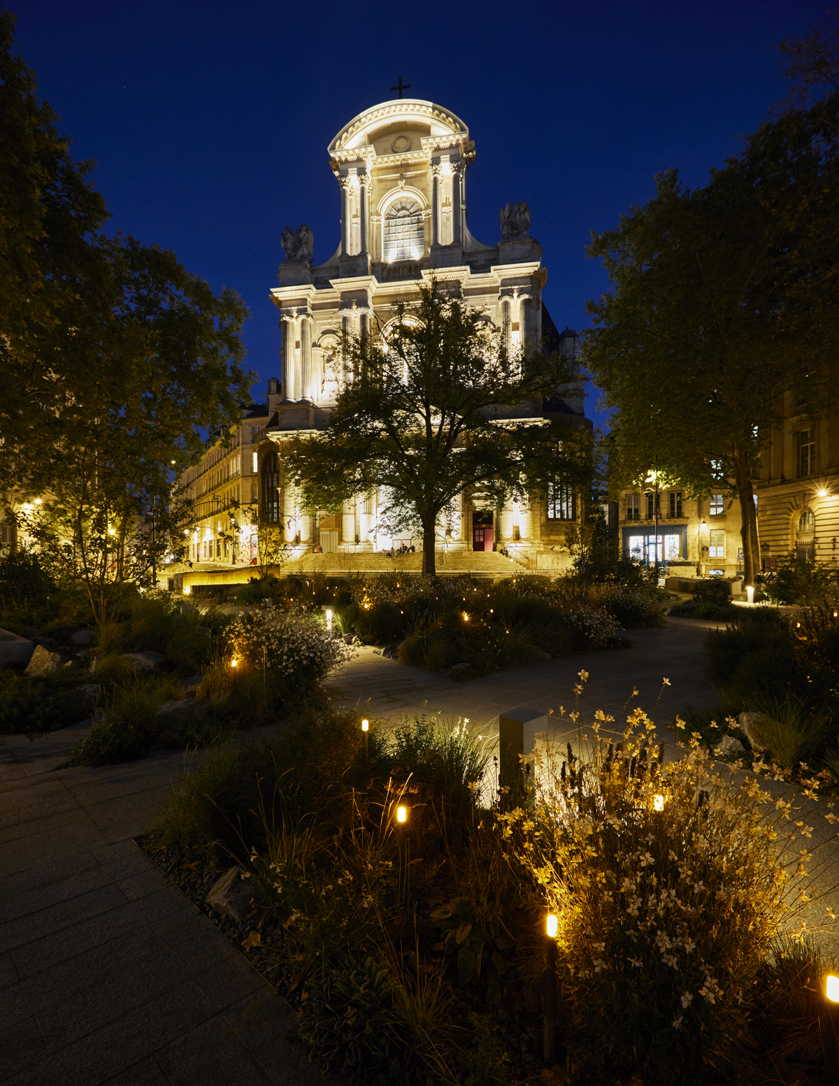 Intéressons-nous à l’éclairage lié à la mémoire des victimes. Dans les massifs plantés, dès la nuit venue, une multitude de points lumineux de faible intensité, en référence aux innombrables victimes directes et indirectes, scintillent de manière aléatoire à l’aide d’un système DMX. “Dissimulées dans la strate végétale, ces sources évoquent des lueurs de bougies (teinte ambrée), une vibration lumineuse diffuse qui rend hommage aux victimes sans jamais les désigner frontalement. L’éclairage se veut ‘vivant’”, décrit Myriam Laval, conceptrice lumière de l’agence ON. La mémoire est ainsi suggérée, non illustrée. “La répartition des ‘lueurs’ n’est pas aléatoire : elle reprend la voute céleste du 13 novembre 2015, jour des attentats, que l’on a transposée au sol pour repérer les points d’implantation”, précise-t-elle.