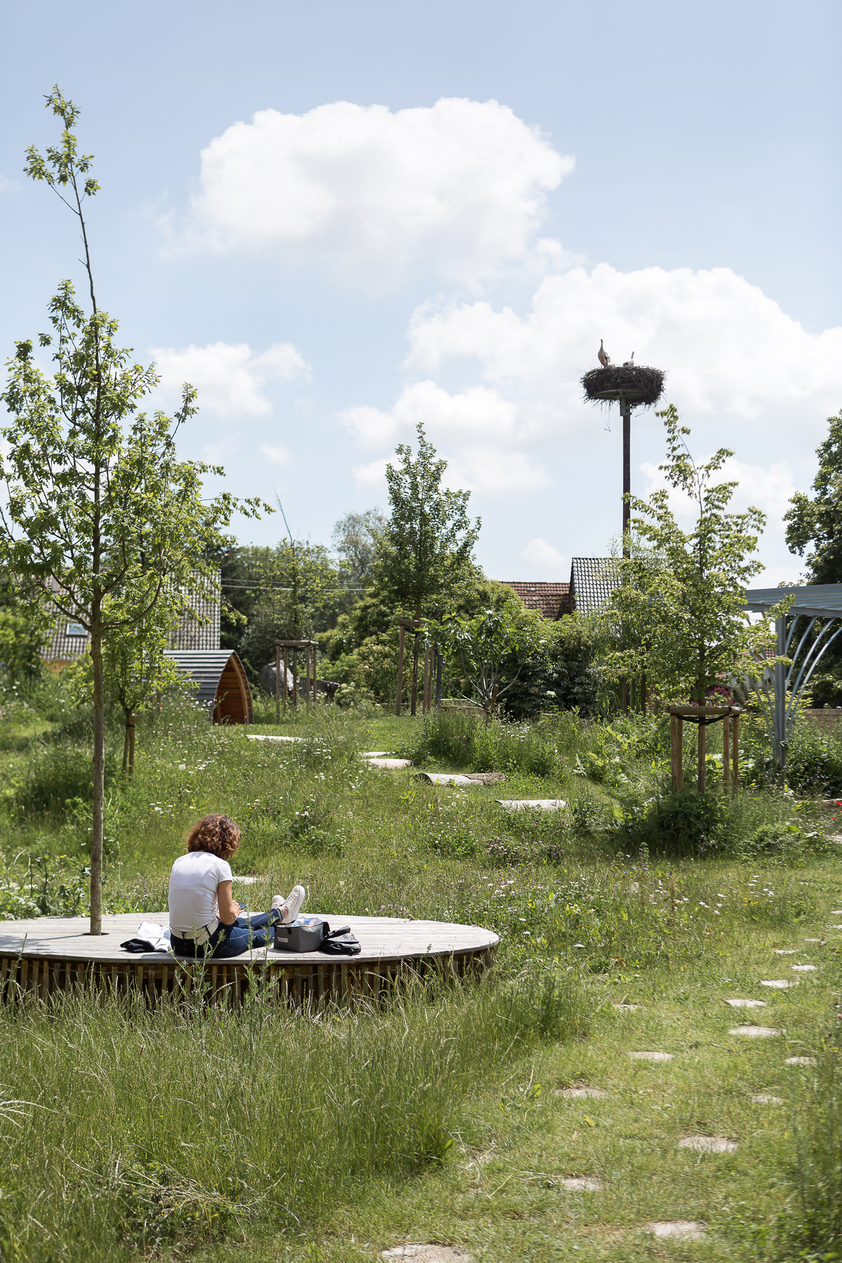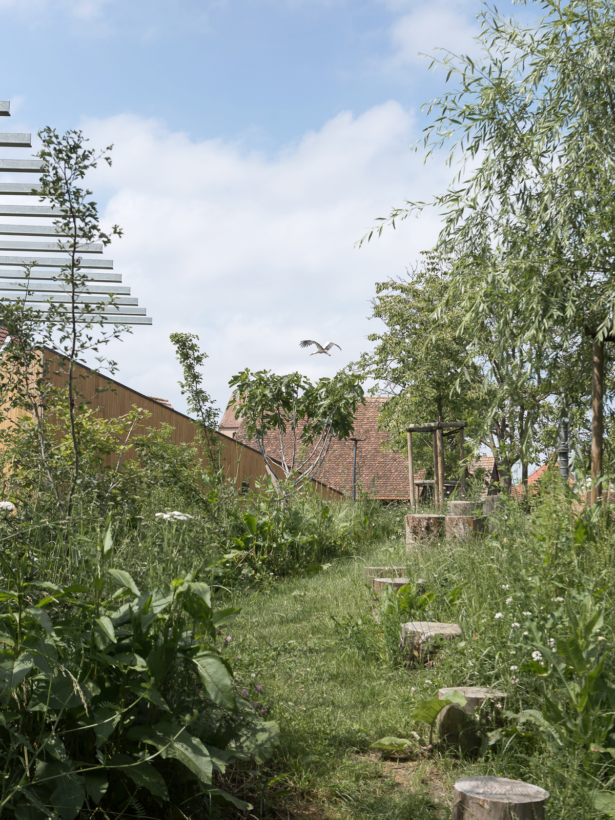 La végétalisation du jardin contribue à créer un îlot de fraîcheur au coeur du bourg. “Au total, 60 arbres ont été plantés et 20 conservés, soit 80 arbres sur une parcelle de 4 525 m2. Parmi les essences choisies figurent notamment des Acer campestre, Carpinus betulus, Acer monspessulanum, Pinus…, plantés dans des fosses de 5 à 8 m3 et enrichies d’un amendement organique”, explique Bruno Gorisse, directeur d’exploitation de l’entreprise Giamberini, en charge des travaux. Agnès Daval poursuit : “La région du Sundgau est historiquement marquée par la présence de vergers au coeur des villages. Dans cette continuité, le verger existant a été enrichi pour devenir un jardin des comestibles.” Un tiers des arbres plantés est fruitier, complété par des arbustes et vivaces comestibles permettant aux habitants de glaner en toute sécurité. “Le reste de la palette répond aux besoins de la biodiversité locale, avec une végétation mellifère et nourricière offrant des habitats différenciés pour les oiseaux, les petits mammifères et l’entomofaune”, explique la conceptrice. Elle poursuit : “Nous avons développé une diversité de milieux et de palettes végétales associées. Des zones creusées accueillent une végétation de milieux humides, tandis que des sols maigres issus du réemploi de structures routières favorisent des plantes adaptées aux milieux secs et pauvres, propices notamment à l’entomofaune”. Au total, 211 arbustes et 2 600 vivaces couvre-sols et aromatiques ont été plantés. Des nids pour les cigognes dominent ce site vivant.