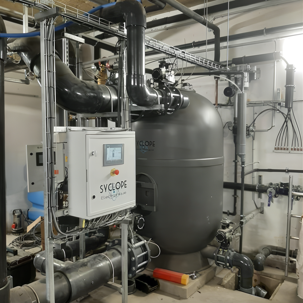 L’établissement dispose de deux filtres à perlite Syclope : un de 1 200 mm de diamètre (débit 230 m3/h) pour le bassin sportif et un de 900 mm de diamètre (débit 93 m3/h) pour le bassin d’apprentissage.